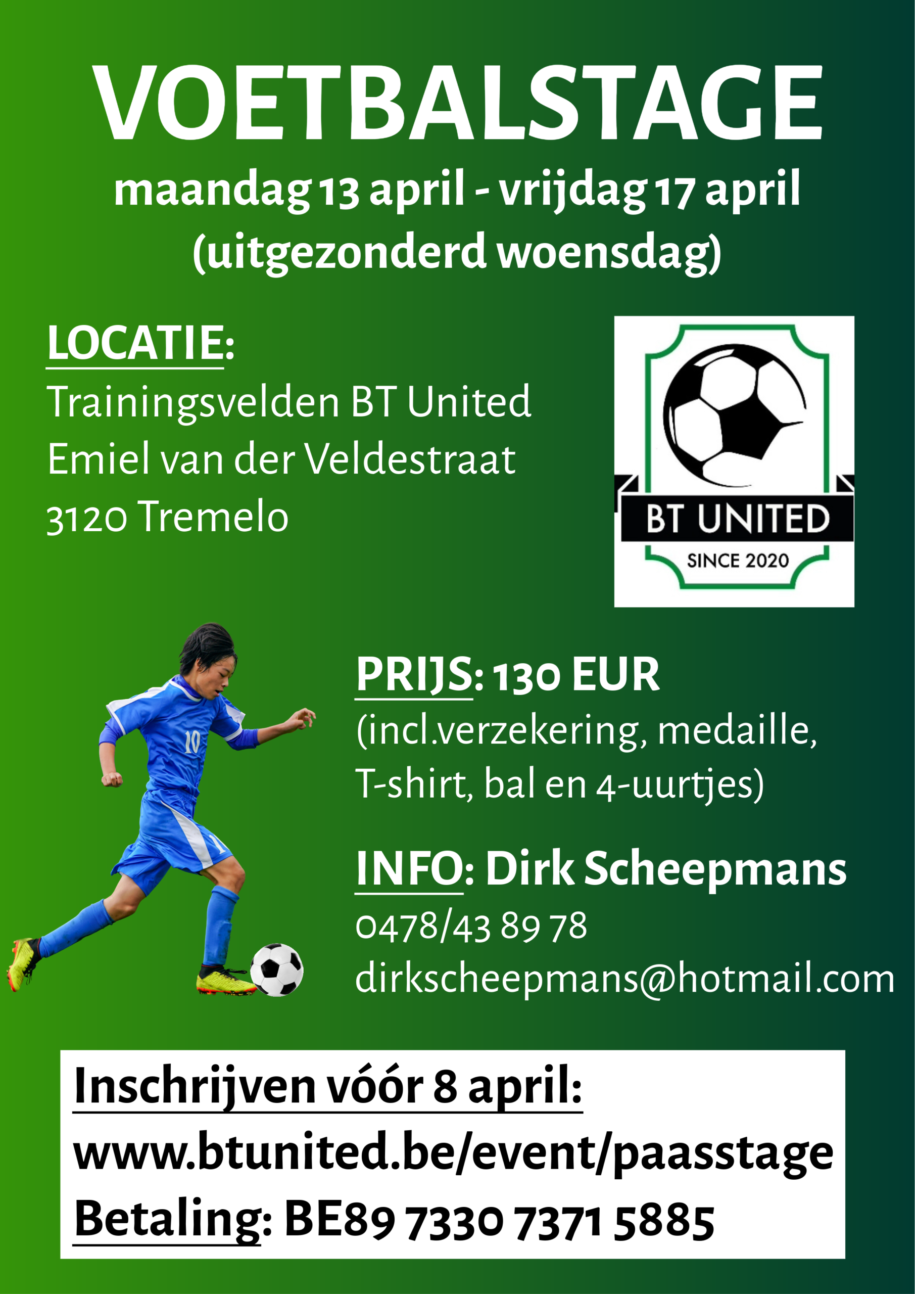 Tijdens de tweede week van de paasvakantie organiseert BT United een voetbalstage. Onze ervaren trainers leren jou nieuwe technieken, verstevigen jouw basis en zorgen voor heel wat voetbalplezier.